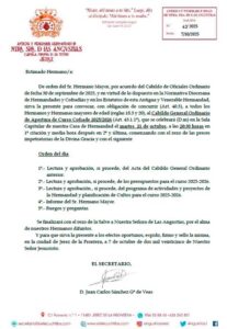 Os adjunto la convocatoria para el Cabildo General Ordinario Apertura de curso 2025//2026 a celebrarse en la sala Capitular de nuestra Casa de Hermandad, el próximo martes 21 de Octubre del presente año, a las 20.30 horas.