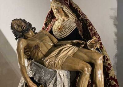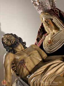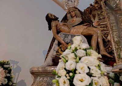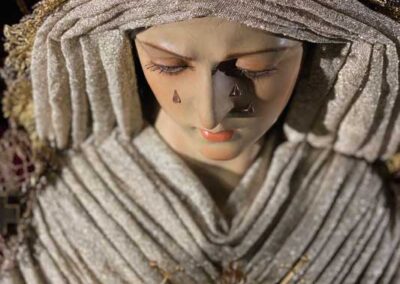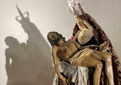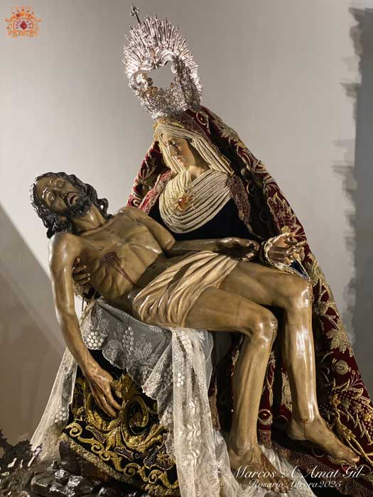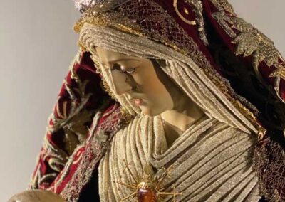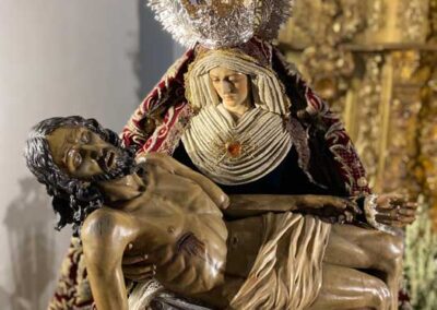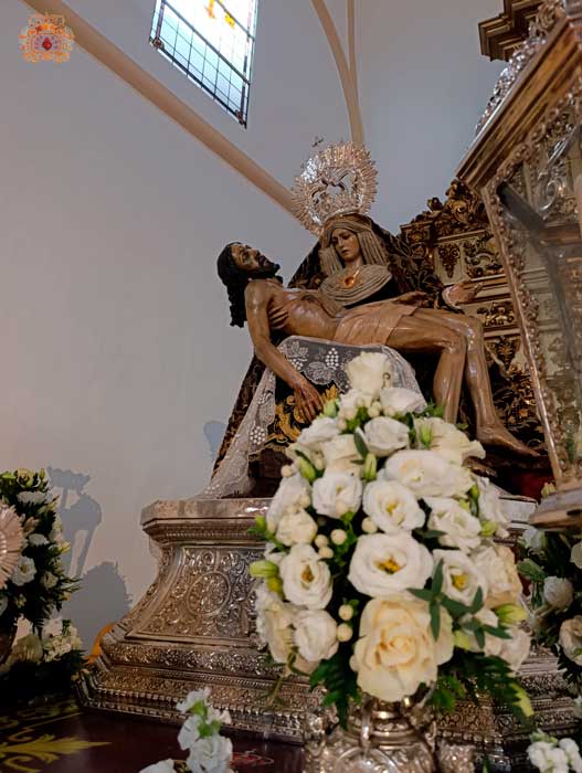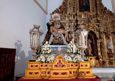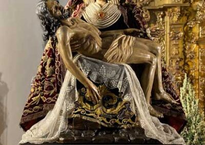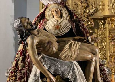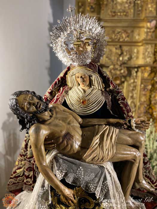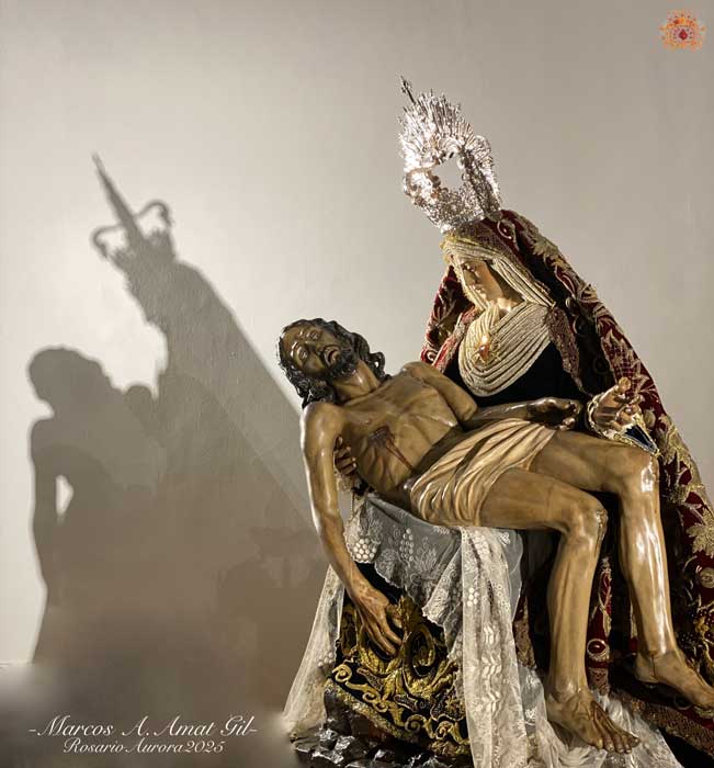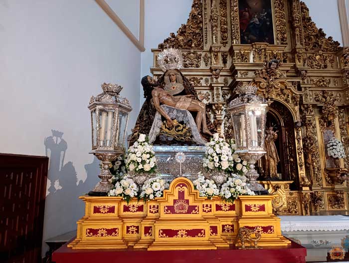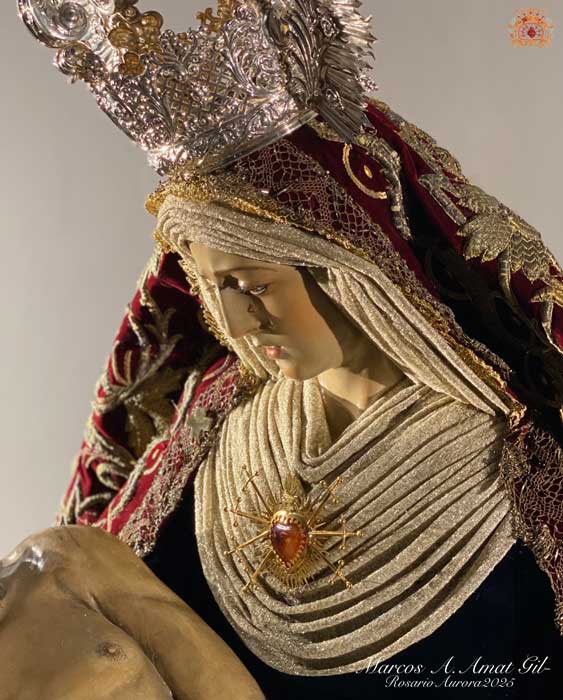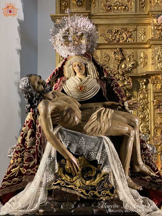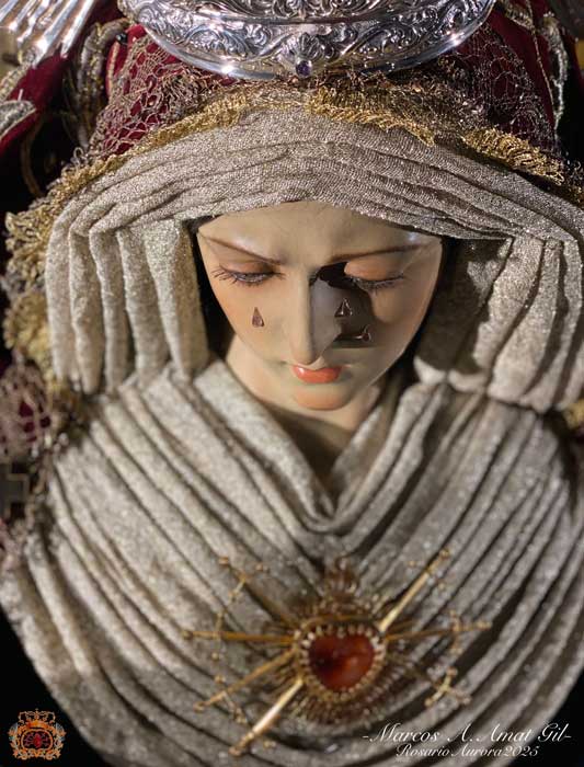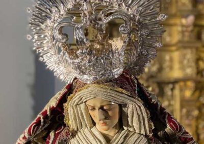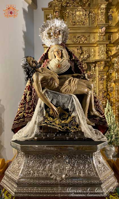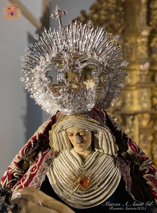 Para la ocasión, la Mayordomía de nuestra Antigua y Venerable Hermandad ha montado un altar efímero en donde se nos muestra a Nuestra Señora de las Angustias en sus andas antiguas de Rosario de la Aurora, ataviada magistralmente por el vestidor D. José Carlos Gutiérrez, con su manto procesional barroco, bordado en oro en terciopelo de seda color burdeos de finales del siglo XVIII y saya azul bordado. Las andas del Rosario de la Aurora están engalanados por un magnífico exorno floral creado por nuestro florista.