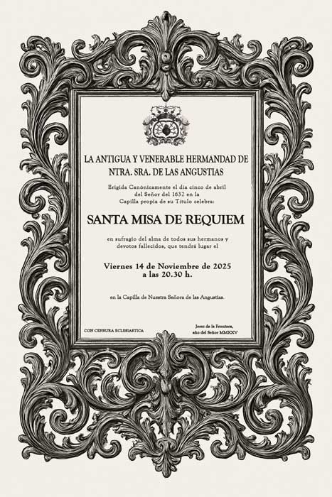 Os informamos que nuestra Antigua y Venerable Hermandad celebrará Santa Misa de Réquiem en sufragio del alma de todos sus hermanos y devotos fallecidos y de una manera muy especial por aquellos fallecidos en el último año. Para ello la Junta de Gobierno ha fijado el viernes 14 de Noviembre a las 20.30 horas para su celebración, en la Capilla de Nuestra Señora de las Angustias.